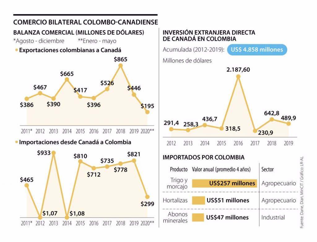 Durante estos años de libre comercio 260 productos colombianos llegaron por primera vez a este país. De estos, 126 corresponden al sector de metalmecánico, 60 al de alimentos, 44 al de moda y textil, y 30 están en el segmento de químicos y ciencias de la vida. En 2019 Colombia contó con 480 empresas exportadoras de productos no minero-energéticos a Canadá, y en 2020, ya son 237 las empresas que comercializan productos colombianos en este mercado.