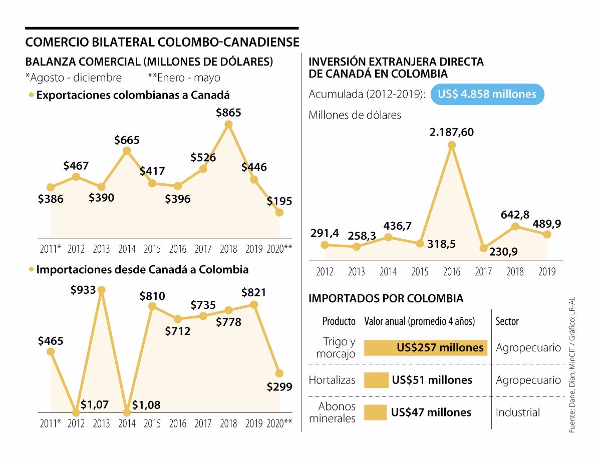 Hace nueve años Canadá se convirtió en el primer país del G7 y del G20 en tener un tratado de libre comercio con Colombia. Desde que el acuerdo comenzó a regir, el 15 de agosto del 2011, las exportaciones colombianas a este país suman más de US$4.750 millones. En ese mismo lapso, las importaciones de productos y servicios canadienses superan los US$7.700 millones. En promedio, el intercambio bilateral alcanza los US$1.400 anuales. Más allá de la balanza comercial, la cooperación y la relación binacional se viene fortaleciendo, impactando positivamente indicadores como la inversión extranjera directa y el flujo de viajeros entre ambas naciones.